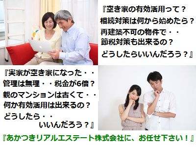 現在又は将来的に住む予定がない方、どう活用したら良いか分からない。そんな疑問がありましたら一度、ご連絡下さい。思い出の詰まったご実家の有効活用を丁寧にお客様の立場にたってアドバイスをさせて頂きます。